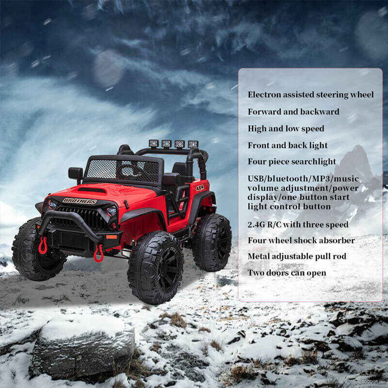 The additional features of a 12V ride on jeep-like multifunction steering wheel, soft two PU leather seats, and off-road PP tires for various road conditions like grass, concrete, and muddy roads. Other standard features like a smooth remote control, a premium sound system, and MP4 player will leave your kids in awe.