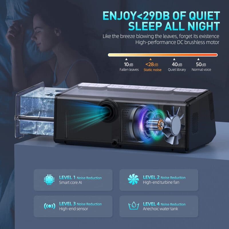 - The full automatic CPAP machine can provide better assistance for your breath. The high-end turbine fan, smart core AI, and high-end sensor ensure a <29DB of quiet sleep all night. The four working models can intelligently work to provide you a comfortable sleeping experience.