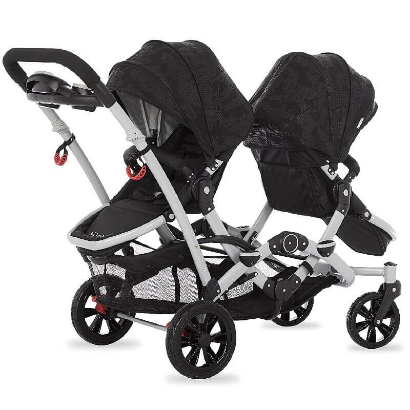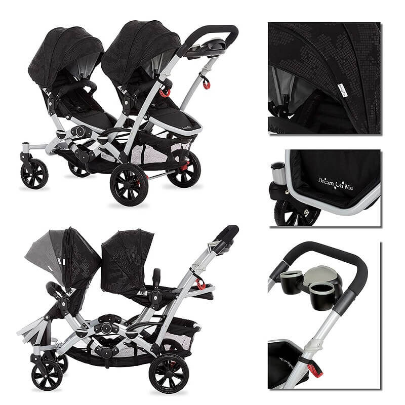 - Safety systems: Both as have 5-point harnesses to provide safety for kids. The suspension wheels can be swiveled and locked so this double stroller has excellent maneuverability. You can stop the stroller with the foot brake even if you let go of the handle.