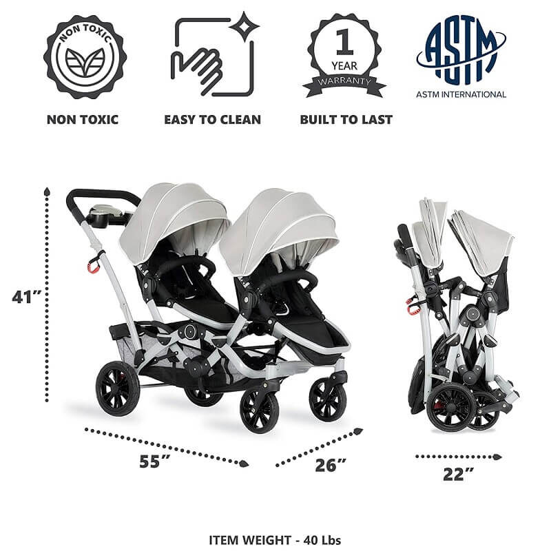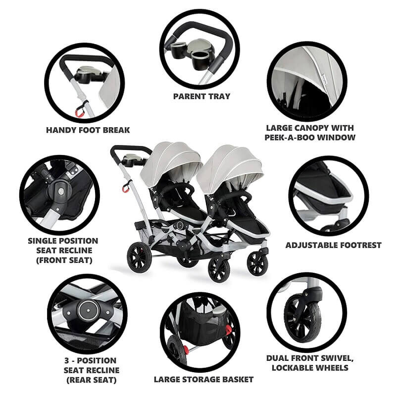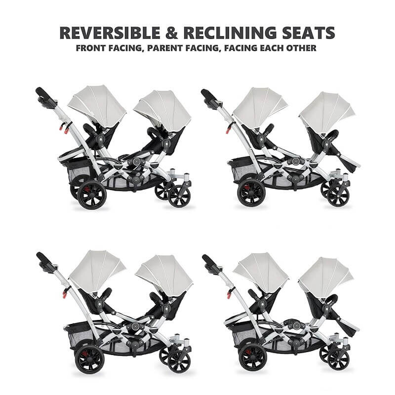 - Multi-position seat: The reversible seat has multiple placement options, allowing your child to face front, face parents or face each other while you can run your legs. The tandem stroller comes with adjustable footrests, a reclining seat, and three adjustable reclining angles for the rear seat.