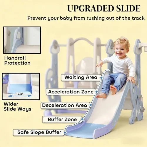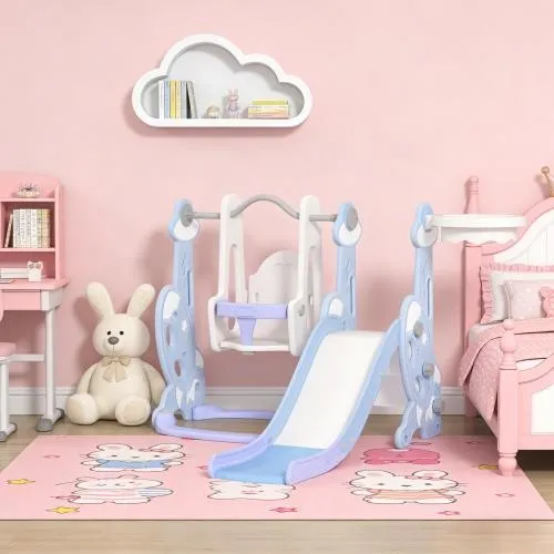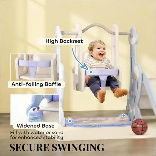 - Includes swing, slide, climber, and basketball hoop for varied fun.